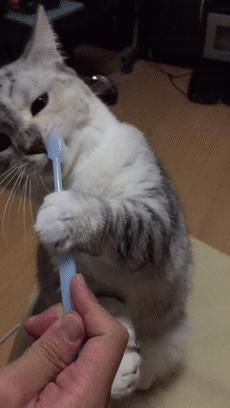 解決“口臭”肯定要做到每天飯後給貓咪刷牙,你可以使用貓咪專用的牙刷,或者用軟布沾溼,套在手指上輕輕擦拭,如果貓咪不配合,你可以適當給予它零食安撫,或在刷完牙後給它零食獎勵。