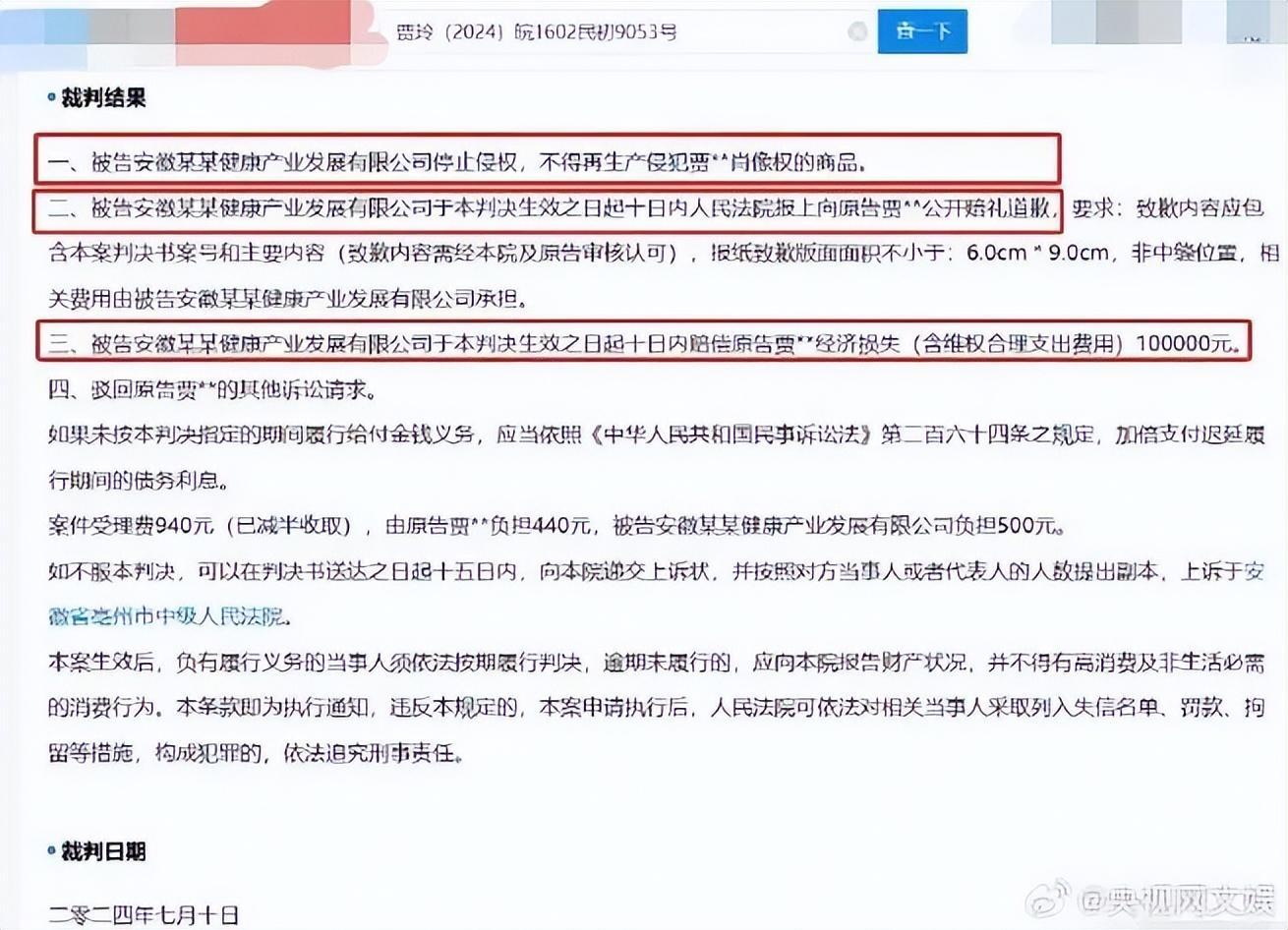 據悉,涉事產品爲“賈女士黑咖啡”,其外包裝上印有賈玲打拳擊的卡通形象。儘管涉事公司辯稱僅生產了5000盒產品,且未審覈出包裝盒上的卡通形象爲賈玲本人,但法院經過審理查明,該公司的行爲已構成侵權,因此判決其停止侵權,並向賈玲公開賠禮道歉,同時賠償經濟損失10萬元。