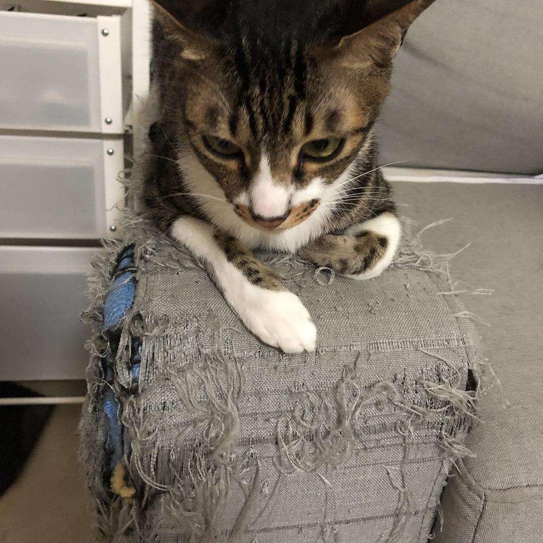 有網友發了個帖子,吐槽自己的貓咪真的好喜歡磨爪:看到我回家後的第一件事情就是跑去磨爪;有時候我把它關籠子裏了,它從籠子裏放出來的第一時間也是跑去磨爪,家裏的沙發已經被它磨得都快看見海綿了,而且它不僅糟蹋沙發,它還把“魔爪”伸向了窗簾、木椅木桌的腿,幾乎家裏能給貓咪磨爪的東西都遭到它的毒手。