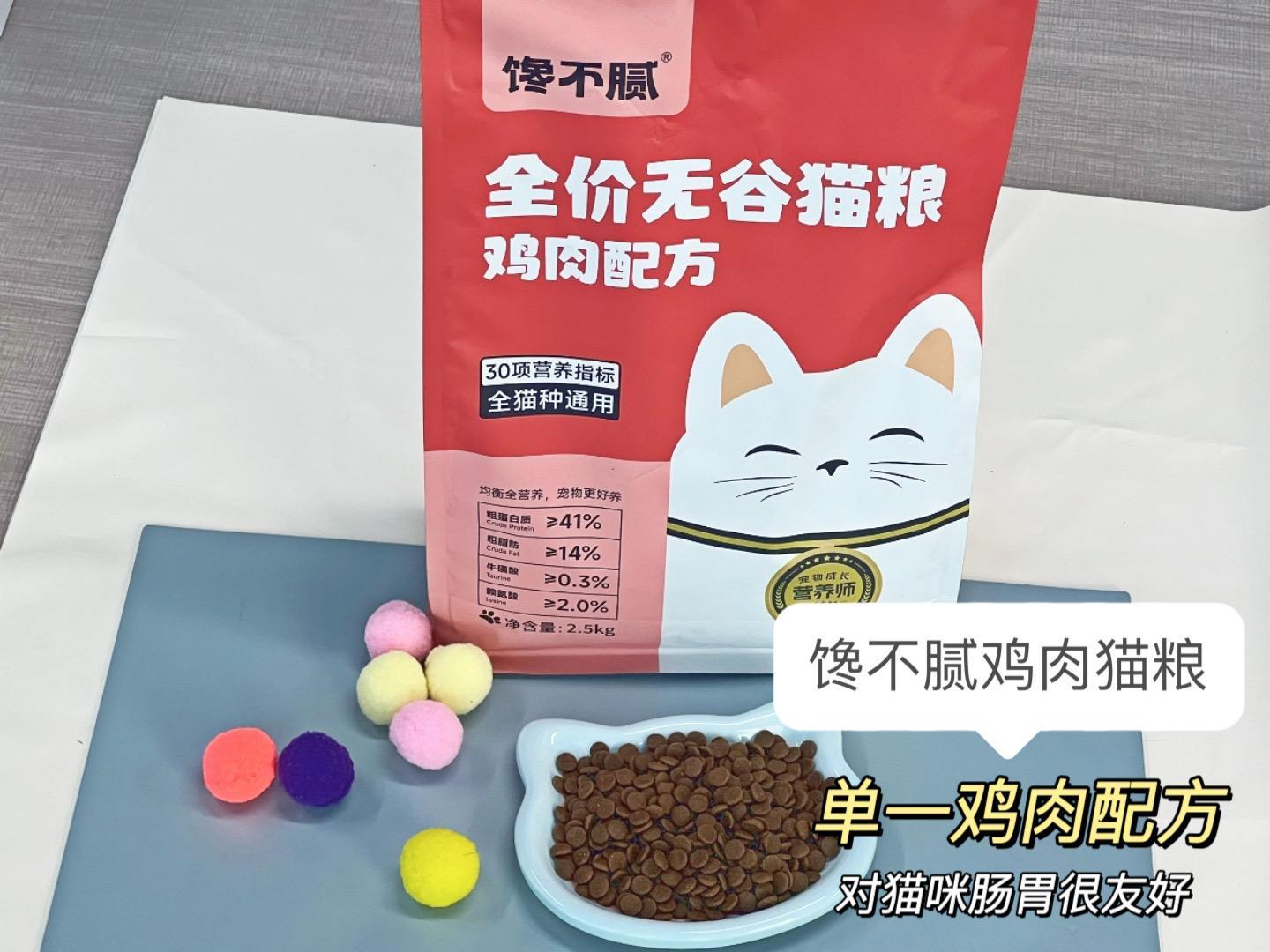 優點:單一肉源,以雞肉爲主要原料,高達83%的動物原料。其中含鮮雞肉32%,12%雞胸肉,肉含量高,粗蛋白≥41%,粗脂肪≥14%,配比科學合理,營養豐富。特別添加益生菌和腸道調節成分,有助於改善貓咪腸胃問題。而且貓糧適口性佳,顆粒適中,貓咪愛不釋口。