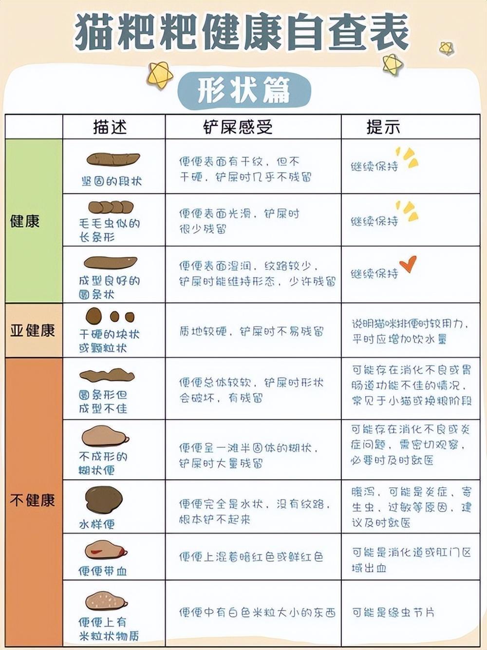 - 食物類型和食量:貓咪的飲食對其大便形態有着直接影響。高纖維、高蛋白的食物有助於形成健康的便便;而低纖維、高脂肪的食物則可能導致便祕或軟便。