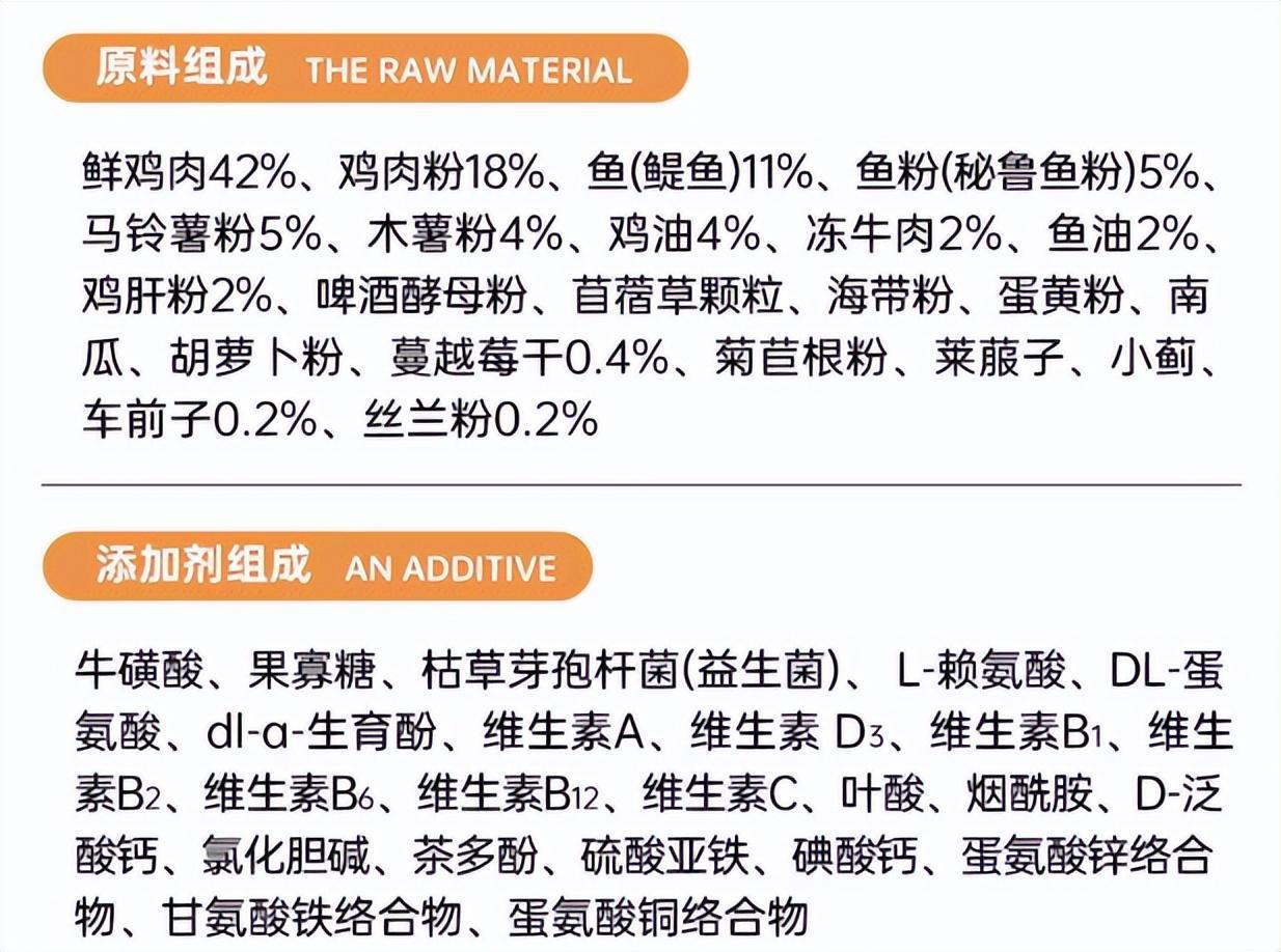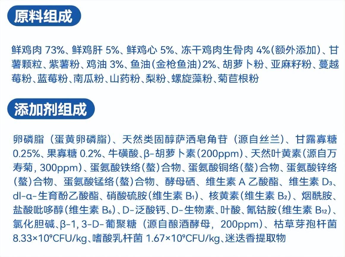 優點:動物性原料高達88%,其中鮮肉含量高,有73%的鮮雞肉,滿滿肉量,能滿足貓咪愛喫肉的天性。粗蛋白≥42%,粗脂肪≥16%,配比合理,營養均衡,還有多種膳食纖維,富含維生素,爲貓咪成長保駕護航。貓糧顆粒適中,方便貓咪咀嚼,還添加了4%凍幹生骨肉,豐富口感,適口性強,貓咪愛喫。