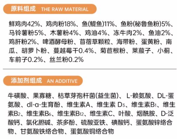 營養豐富:含肉量高達86%,以雞肉爲主,輔以牛肉、魚肉等優質肉類,滿足了貓咪的食肉天性。粗蛋白含量≥43%,粗脂肪≥14%以上,鈣磷比合理,同時添加了豐富的牛磺酸(≥0.4%),有助於貓咪的心臟健康、免疫系統和眼睛健康。添加了益生菌成分,有助於調理貓咪的腸胃。添加了深海魚油和海帶粉等成分,有助於貓咪美毛護膚,保持毛髮亮麗。