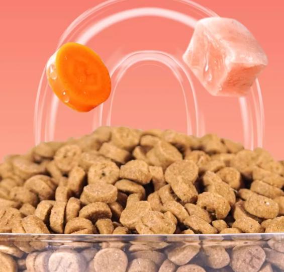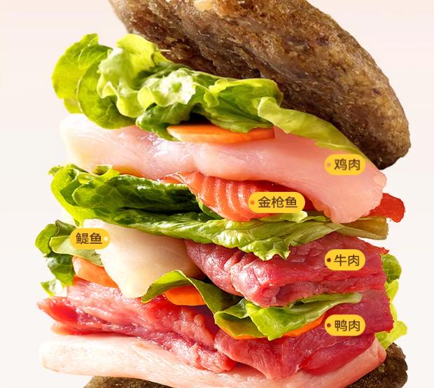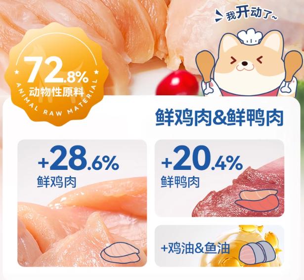 主要成分:動物性原料佔比高達72.8%,鮮肉含量更是高達49%。其中鮮雞肉28.6%、鮮鴨肉20.4%、雞肉粉13.5%、雞油5.3%、雞肝粉2%、凍幹雞肉沫1.5%、魚油1.5%。