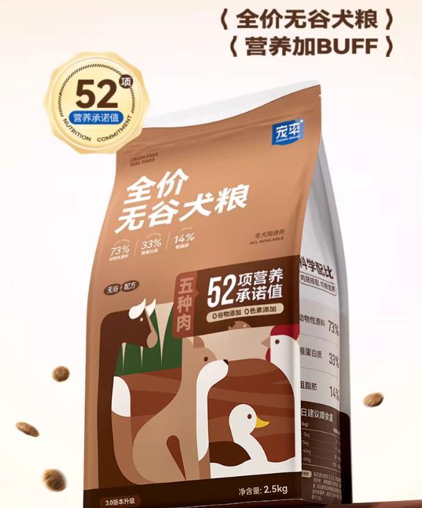 寵率狗糧採用無谷配方,不含穀物、豆類和合成誘導劑、人工色素和有害防腐劑,降低了狗狗的過敏風險,同時確保了狗糧的消化吸收率。它含有五種動物性原料,包括鮮雞肉、鮮鴨肉、魚肉、牛肉等,滿足了狗狗對動物蛋白的需求。同時添加了維生素D、維生素A、維生素B和果寡糖等營養成分,有助於狗狗的骨骼發育、毛髮柔順和新陳代謝調節。