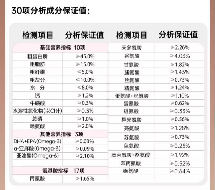 “粗蛋白質”:建議選擇36%以上的,能滿足貓咪的營養需求,利於貓咪長肉!