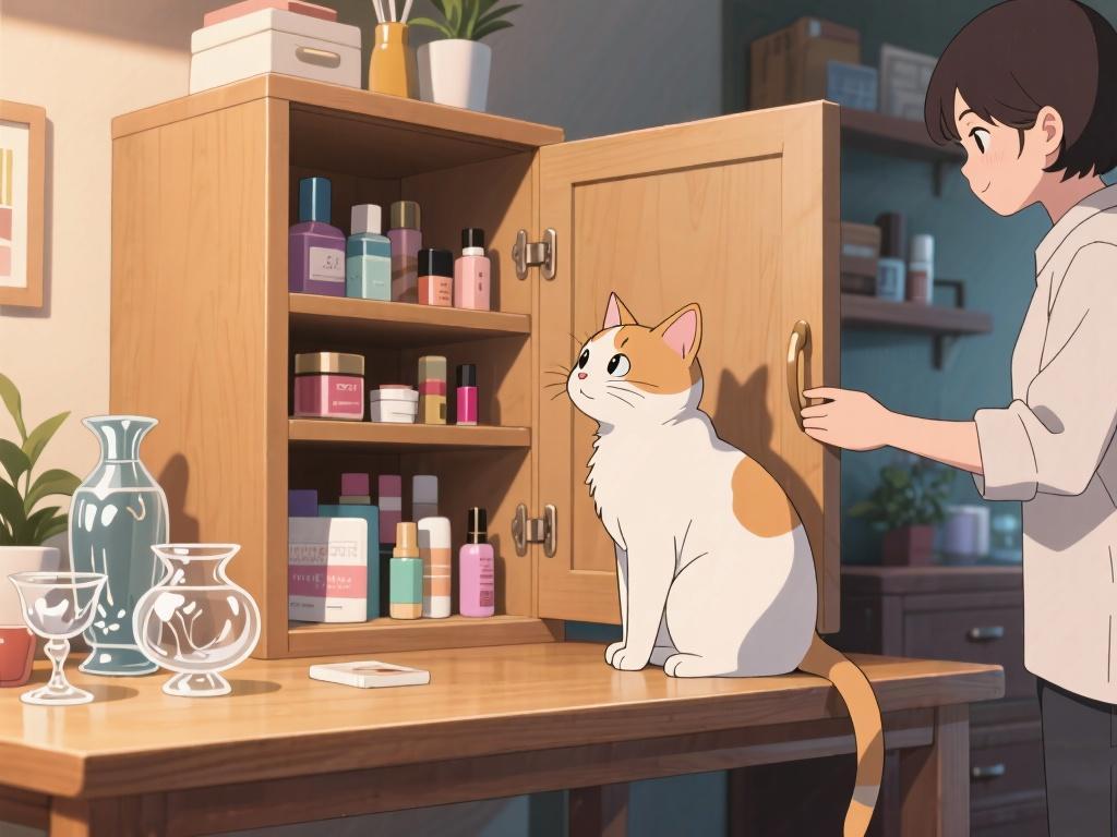 口紅、香水這些化妝品,收納好放起來,它碰不到自然就不會拍落。不過有個誤區,有人把東西放高處,覺得貓碰不到,可貓喜歡高的地方,這反而可能勾起它的興致,它會想法子跳到高處。