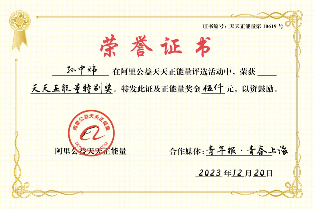 爲了感謝孫中煒在音樂普及教育中對特殊兒童的辛勤培育,阿里公益天天正能量決定聯手青年報,爲孫中煒頒發天天正能量獎及5000元獎勵: