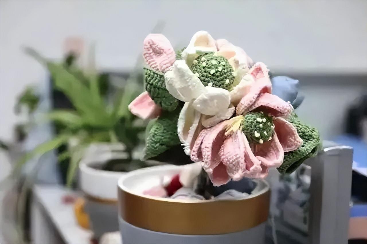 走出倉庫,來到辦公室,簡陋的展示櫃上陳列着大學生們巧手改造的布包、帽子、地板襪等,甚至還有用絨線織就的一盆創意絨線花。