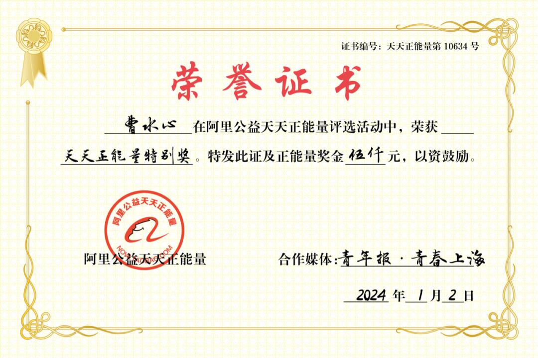 通過二手衣服再利用,他窺見環境保護是人類共同的社會問題。阿里公益天天正能量聯合青年報·青春上海,爲曹水心頒發天天正能量特別獎及5000元公益金: