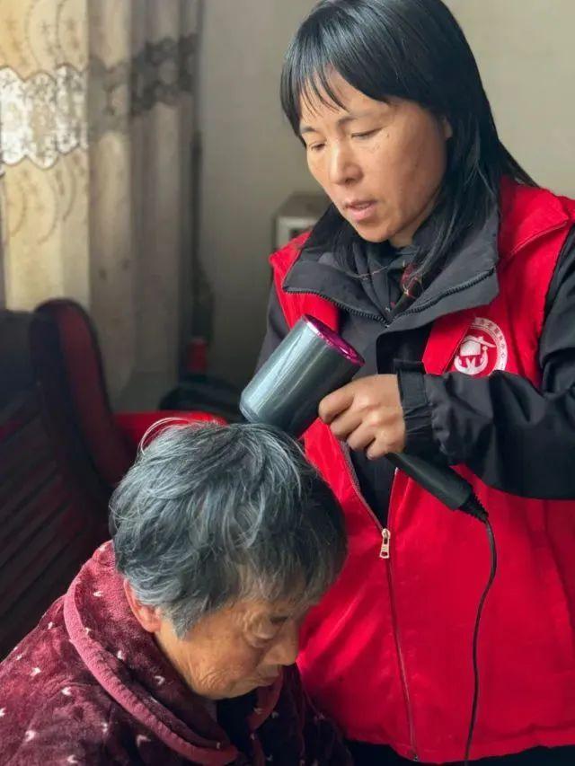 爲老人洗完澡後,徐芝英細心地幫老年人吹乾頭髮