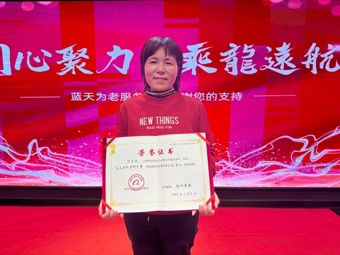 1月5日,徐芝英收到了阿里公益天天正能量聯合杭州日報頒發的20000元正能量獎金和頒獎詞: