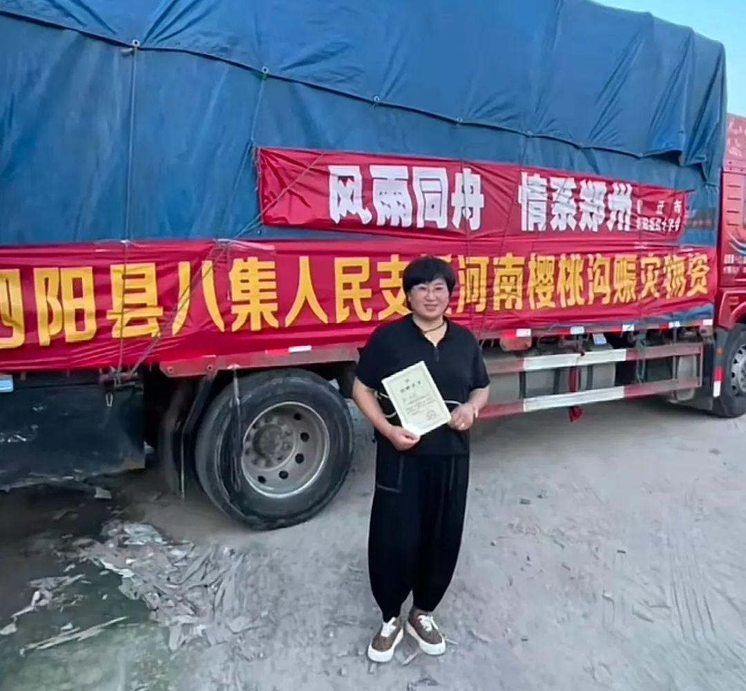 李紅霞給河南鄭州櫻桃溝災區送去一大車救災物資