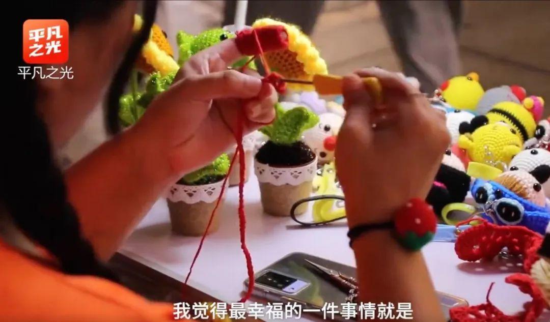 “一直都是家人出錢給我治療,生活費也靠家人,發現可以賣花賺錢,像是人生中突然透進來一道光。”梁正英非常驚喜,開始學習各種毛線編織工藝,白天在病房邊治病邊編織,晚上坐着輪椅外出擺攤,解決自己的生存問題。