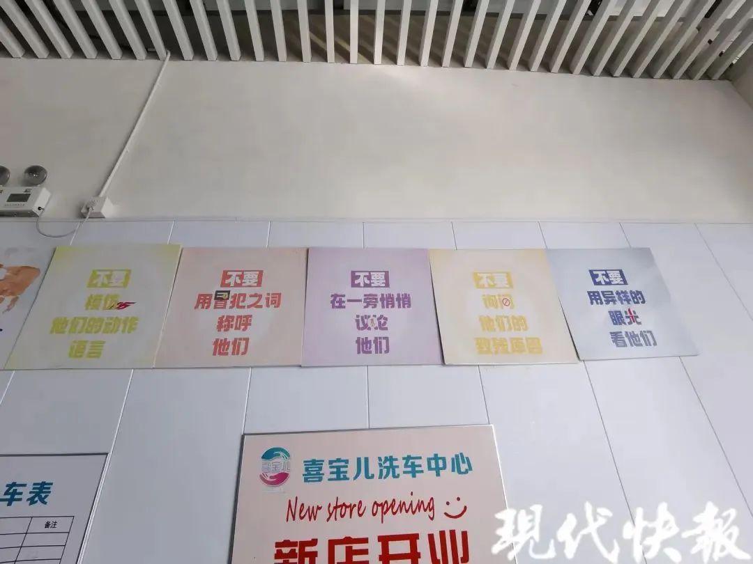 江蘇省南通市有一家特殊的洗車店,店裏有六個員工和一個年輕的老闆,老闆負責平常與顧客溝通,六個員工圍繞在僅有的一個洗車位前,有的用水槍噴車身,有的用抹布擦拭,但他們很少說話,只默默幹活。