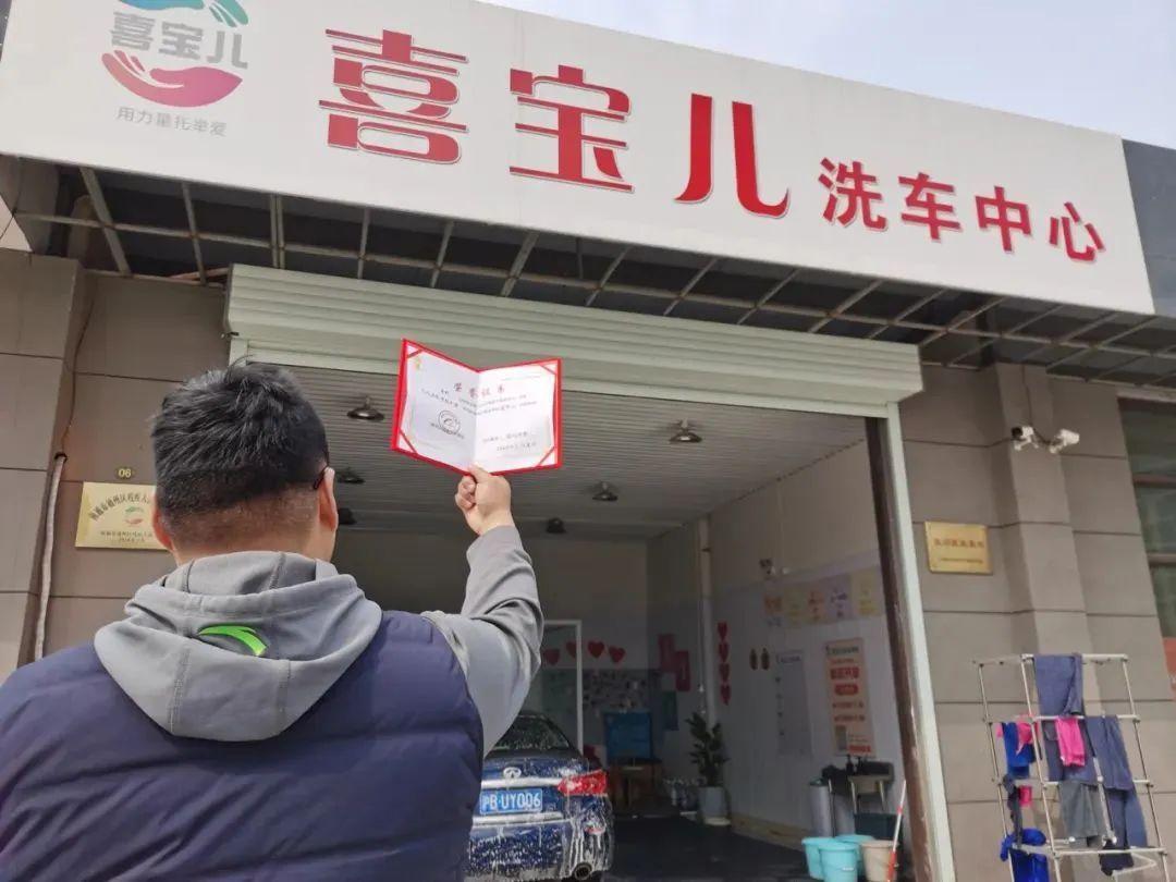 2023年11月,這家洗車店開張營業。店名叫“喜寶兒”,名字和logo都是他自己設計的。“‘喜寶兒’是對我們這羣特殊員工的暱稱,logo是上下兩隻手圍繞這三個字,帶有呵護和保護他們的含義。”季輝說。
