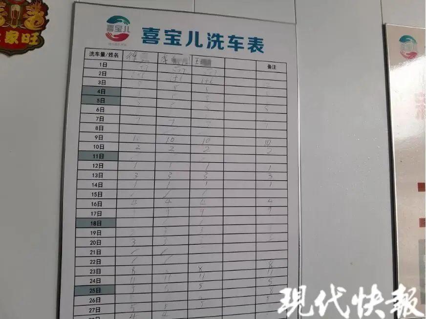 爲了打消公衆的質疑,店裏的收入支出都是透明化管理的。店裏還懸掛了一張洗車表,每天都會寫上每個員工的洗車數量,來給大家分配工資。