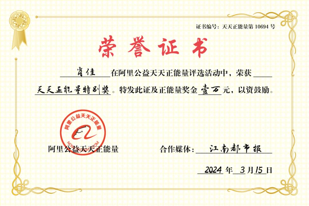 她活出了自己最美的樣子,也幫無數視障姐妹找到自我,阿里公益天天正能量聯合江南都市報,爲肖佳頒發天天正能量獎勵及萬元獎勵金: