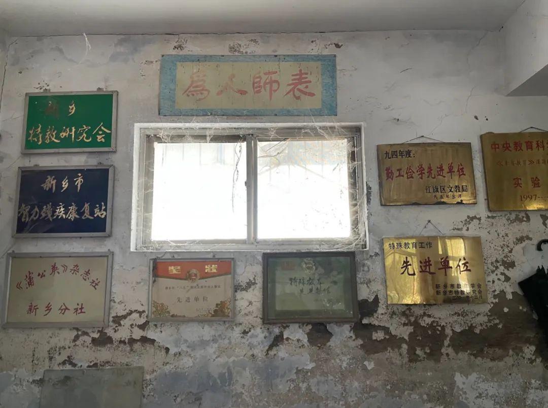 表面脫落斑駁的牆上掛滿了這所學校所獲得的榮譽:1996年河南省教育委員會頒發的“河南省特殊教育工作先進單位”、新鄉市“八五”期間發展殘疾人事業先進單位的獎狀、家長送的寫有“老師如父母,校園如家庭”的錦旗......