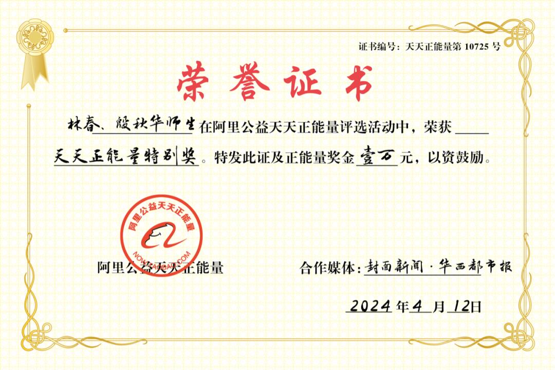 阿里公益天天正能量聯合封面新聞·華西都市報,爲林春、殷秋華師徒頒發正能量特別獎,敬熱愛,敬不屈的生命,敬人間善良與大義: