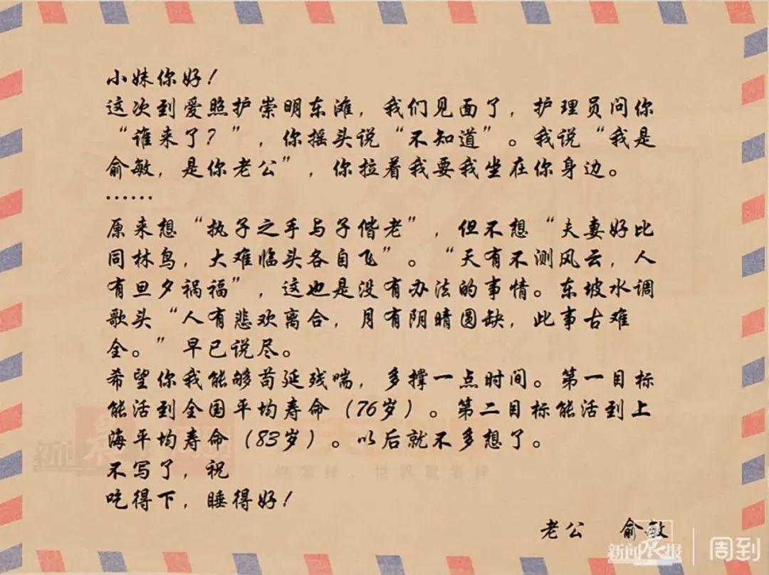 小妹你好!這次到愛照護崇明東灘,我們見面了,護理員問你“誰來了?”,你搖頭說“不知道”。我說“我是俞敏,是你老公”,你拉着我,要我坐在你身邊。……原來想“執子之手與子偕老”,但不想“夫妻好比同林鳥,大難臨頭各自飛”。“天有不測風雲,人有旦夕禍福”,這也是沒有辦法的事情。東坡水調歌頭“人有悲歡離合,月有陰晴圓缺,此事古難全”,早已說盡。希望你我能夠苟延殘喘,多撐一點時間。第一目標能活到全國平均壽命(76歲)。第二目標能活到上海平均壽命(83歲)。以後就不多想了。不寫了,祝喫得下,睡得好!