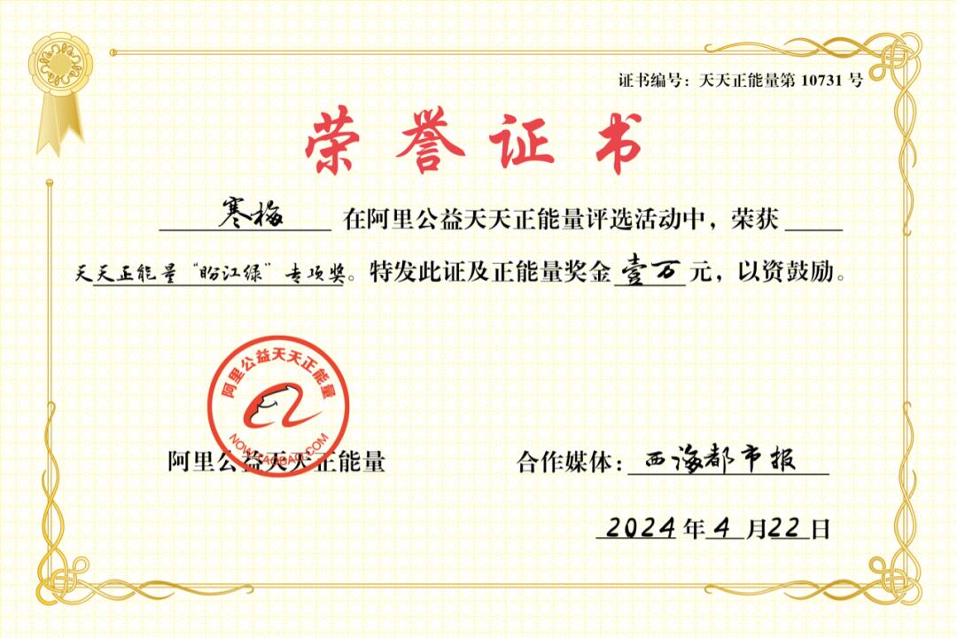 至今,阿里公益“天天正能量”已爲多位“盼江綠”環保志願者頒發特別緻敬人物獎。
