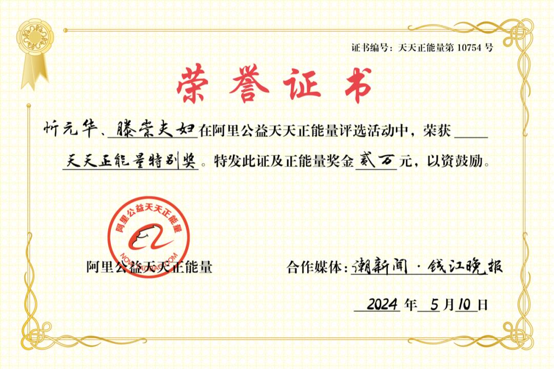 阿里公益天天正能量聯合潮新聞·錢江晚報,用一份正能量特別獎向忻元華、滕崇夫婦致敬: