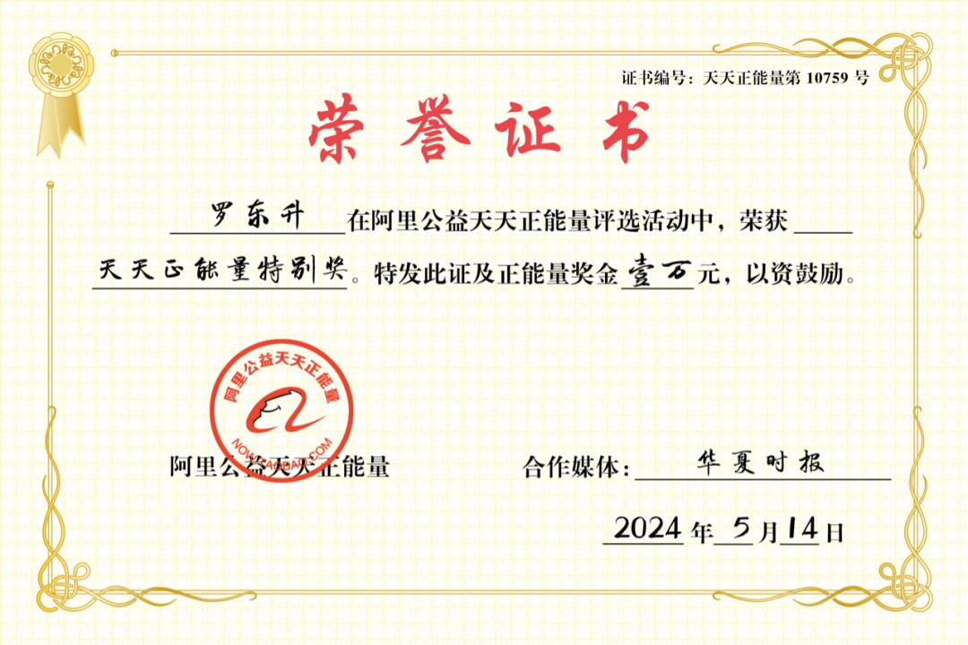 阿里公益天天正能量聯合華夏時報,爲羅東昇頒發10000元天天正能量特別獎: