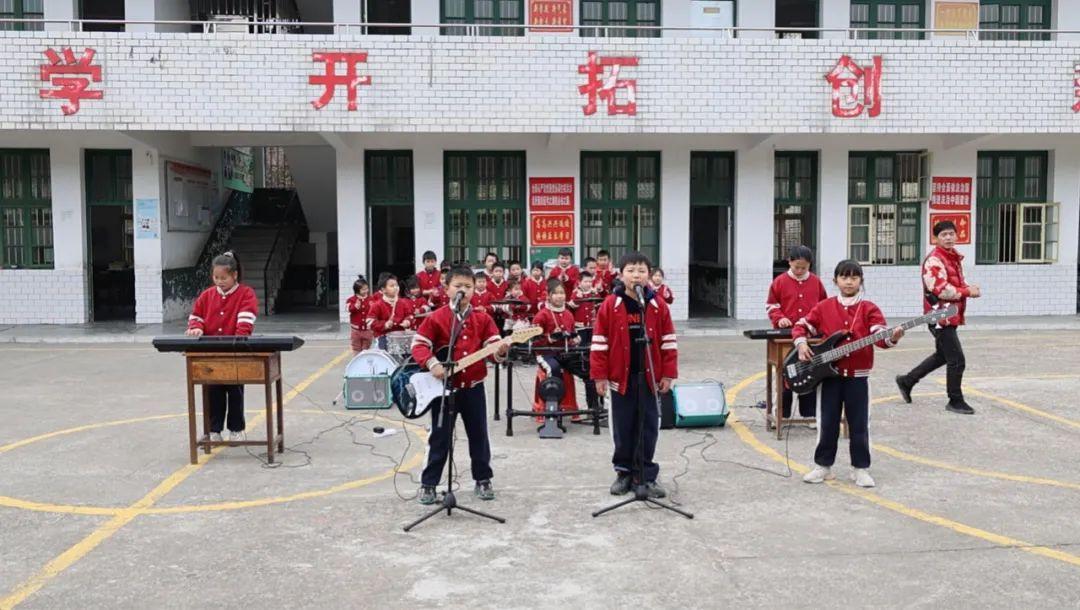 湖南衡陽縣妙溪小學,音樂志願者文勁帶領樂隊的孩子們,認真練習貝斯、電子琴和架子鼓,歌聲在校園內迴響。