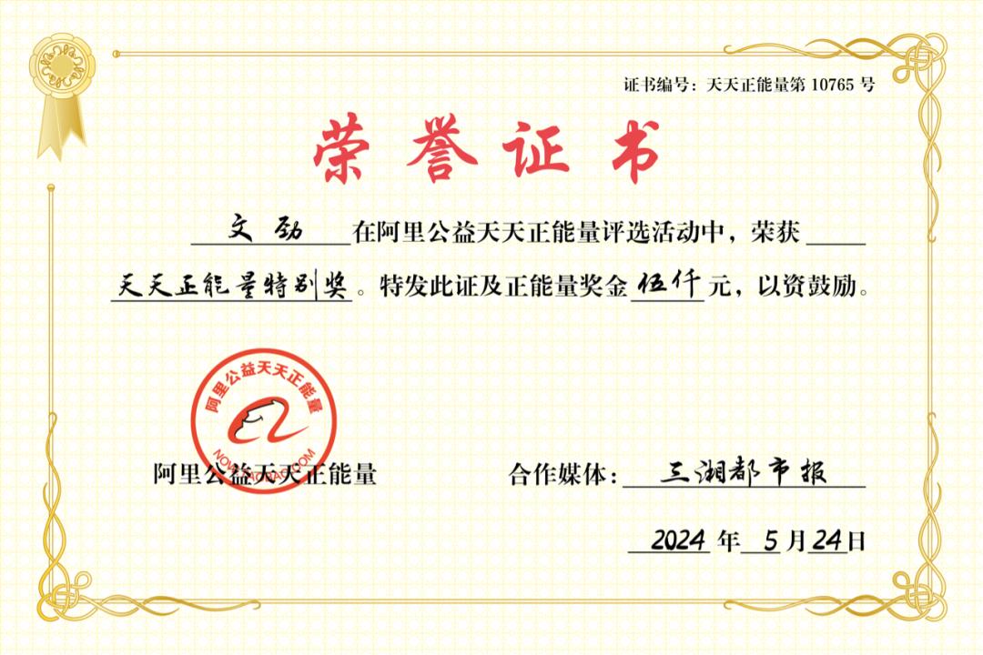 阿里公益天天正能量聯合三湘都市報,決定爲文勁頒發正能量獎勵,助力他和山村孩子們的音樂夢想: