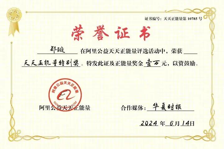 阿里公益天天正能量聯合華夏時報,用一份正能量特別獎送上對鄭璇教授的敬意: