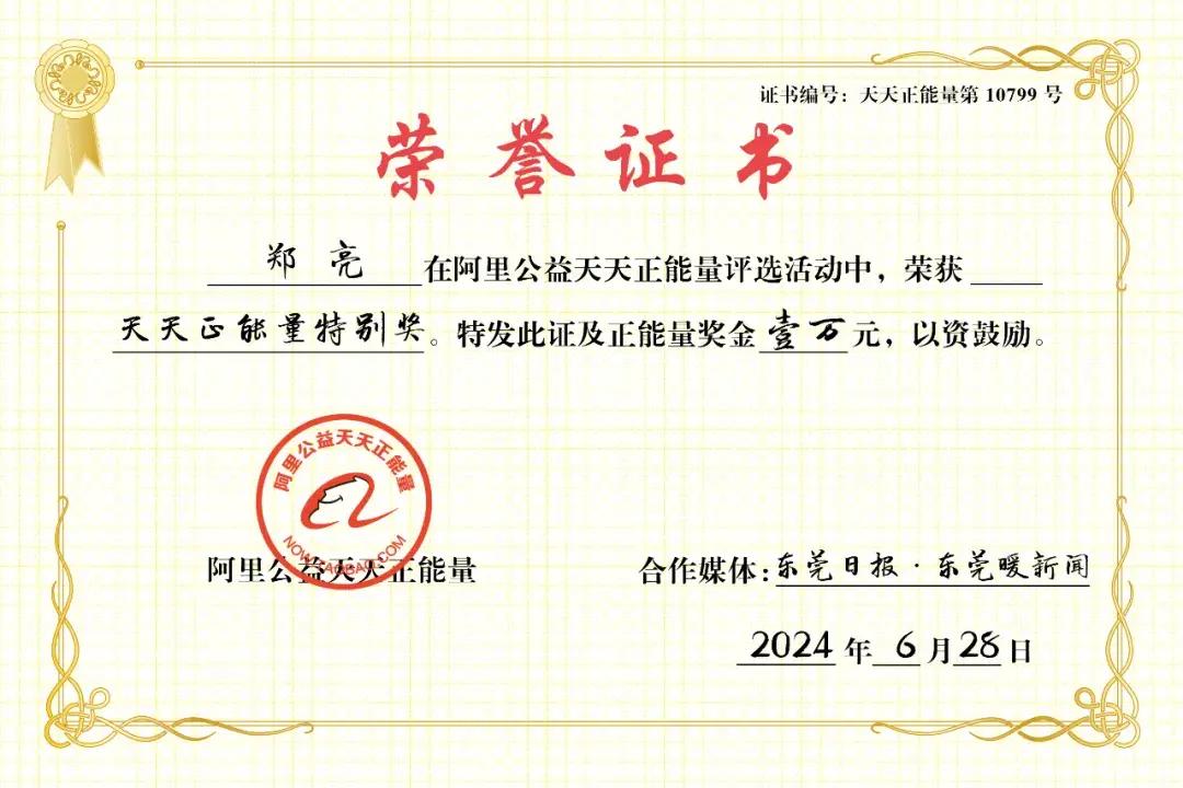 阿里公益天天正能量聯合東莞日報·東莞暖新聞,爲鄭亮頒發天天正能量特別獎10000元,助力新車間兒童活動室搭建: