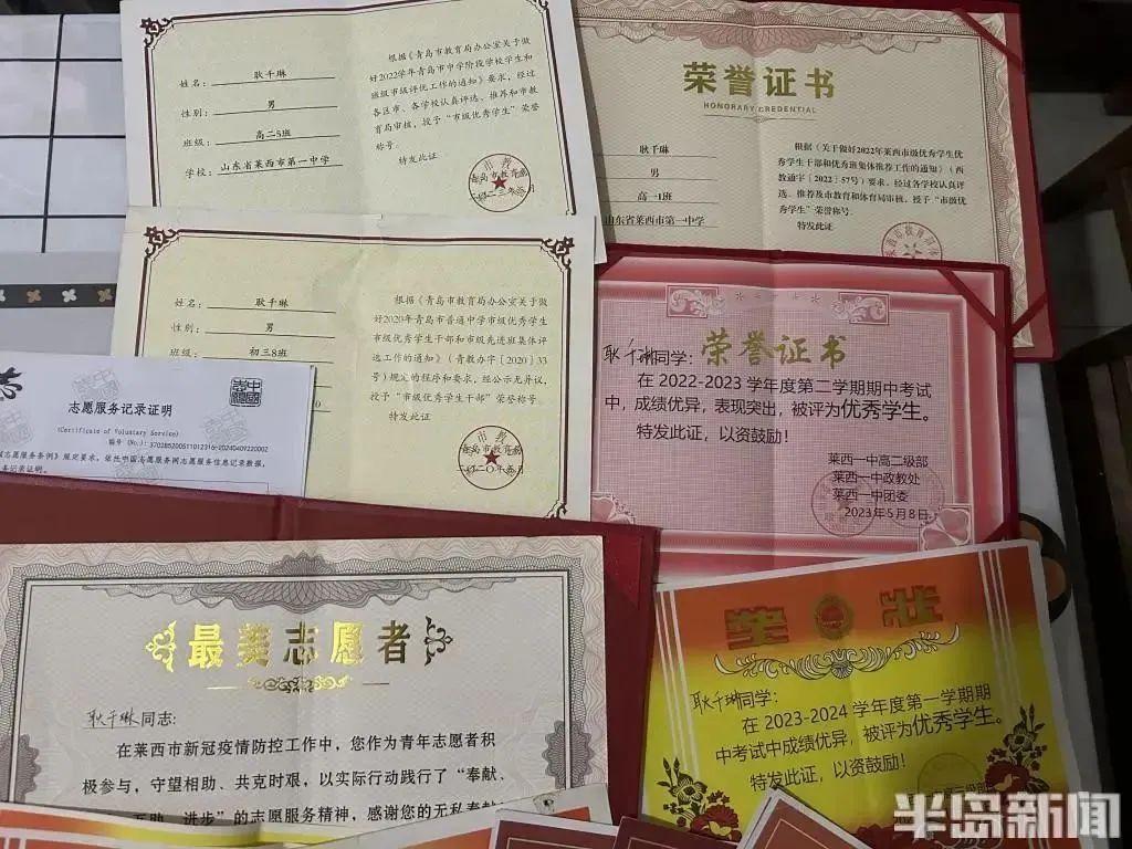 裏面多數是優秀班幹部、優秀學生等學習方面的褒獎,還有不少是耿千琳當志願者所獲的社會公益和志願服務的榮譽。