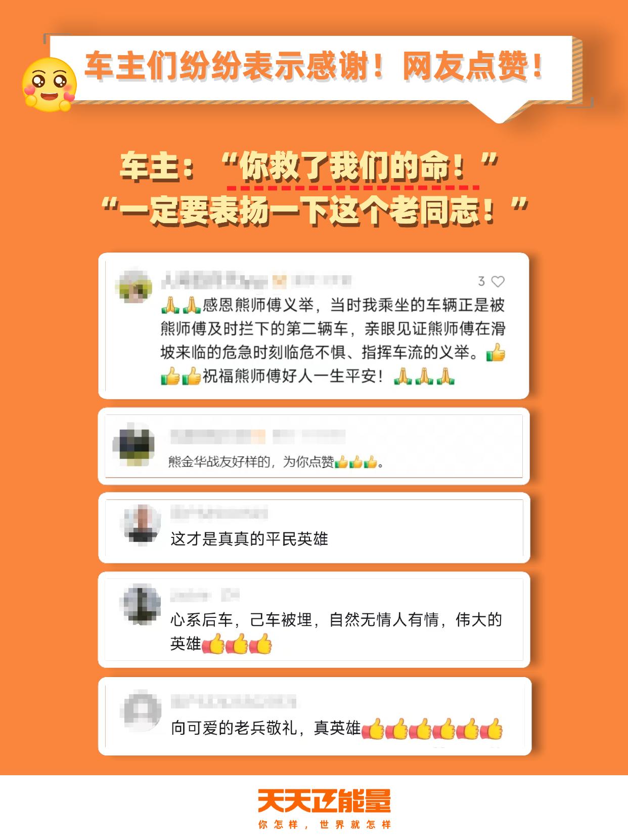 危急時刻,大叔熊金華第一時間下車,站在路中央揮動雙手,攔停了100百多輛車,成功避免了一場大型傷亡事故。