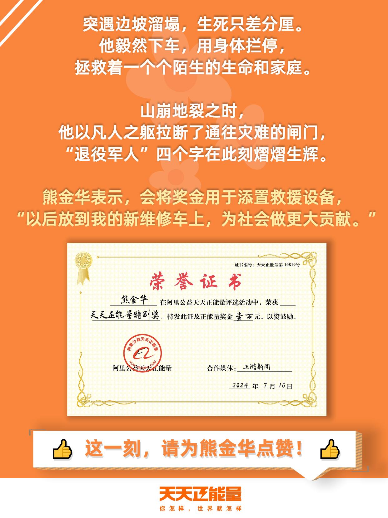 阿里公益天天正能量聯合上游新聞,送上一份萬元獎勵向熊金華致敬,一起爲平民英雄點贊!