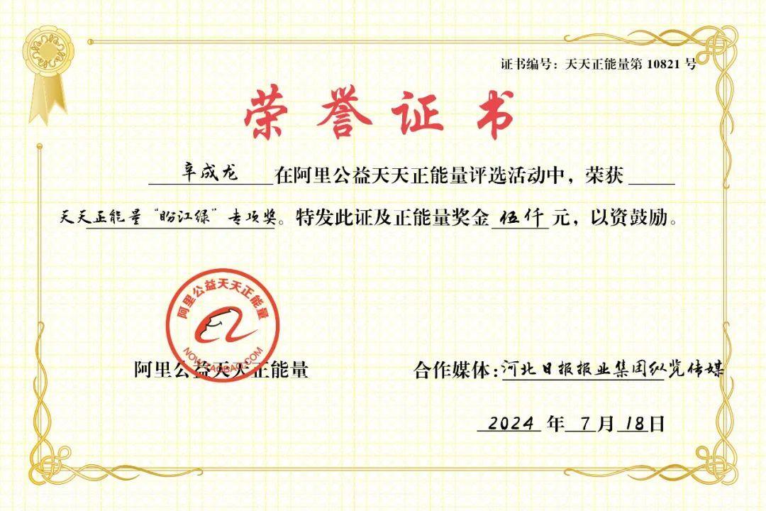 阿里公益“天天正能量”聯合河北日報報業集團縱覽傳媒,爲辛成龍頒發正能量“盼江綠”專項獎: