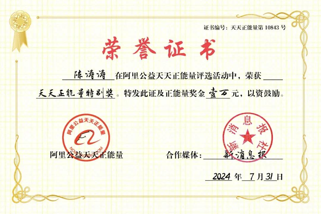 阿里公益天天正能量聯合新消息報,爲陳濤濤送上萬元正能量獎勵: