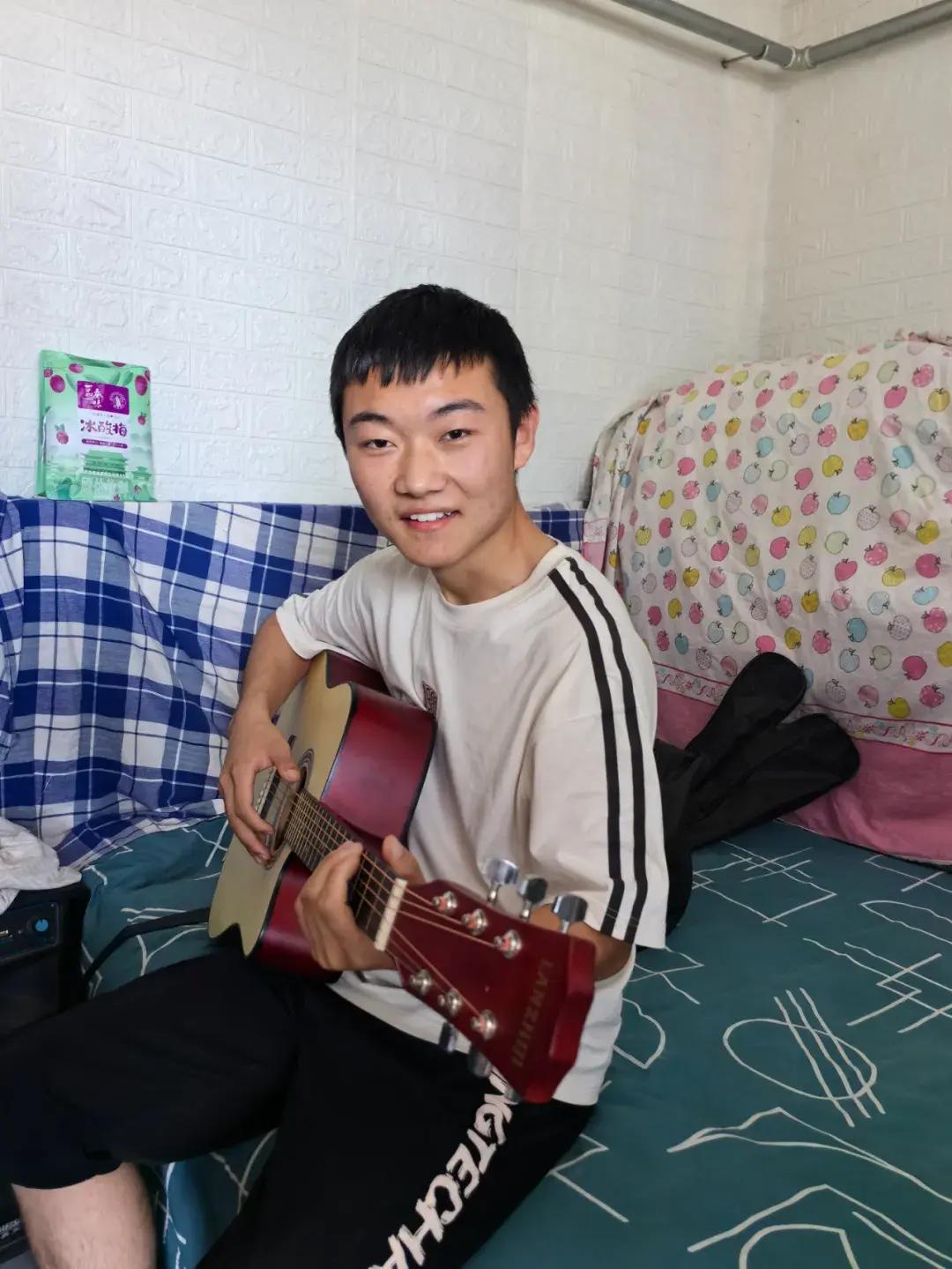 18歲的梁紅軍笑着彈吉他