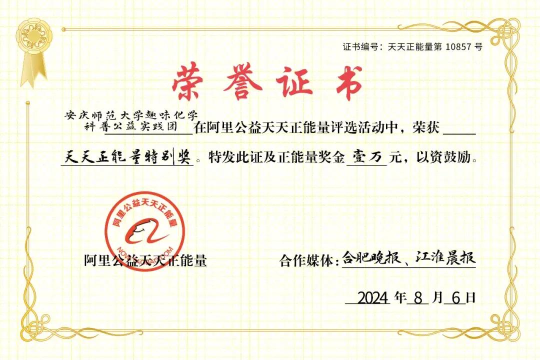 阿里公益天天正能量聯合合肥晚報、江淮晨報,爲安慶師範大學趣味化學科普公益實踐團頒發正能量特別獎及萬元獎金: