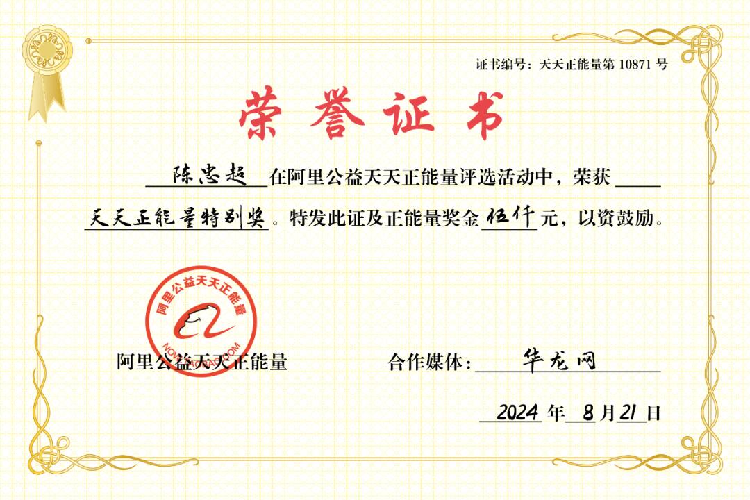 阿里公益天天正能量聯合華龍網,爲陳忠超送上一份天天正能量獎勵:
