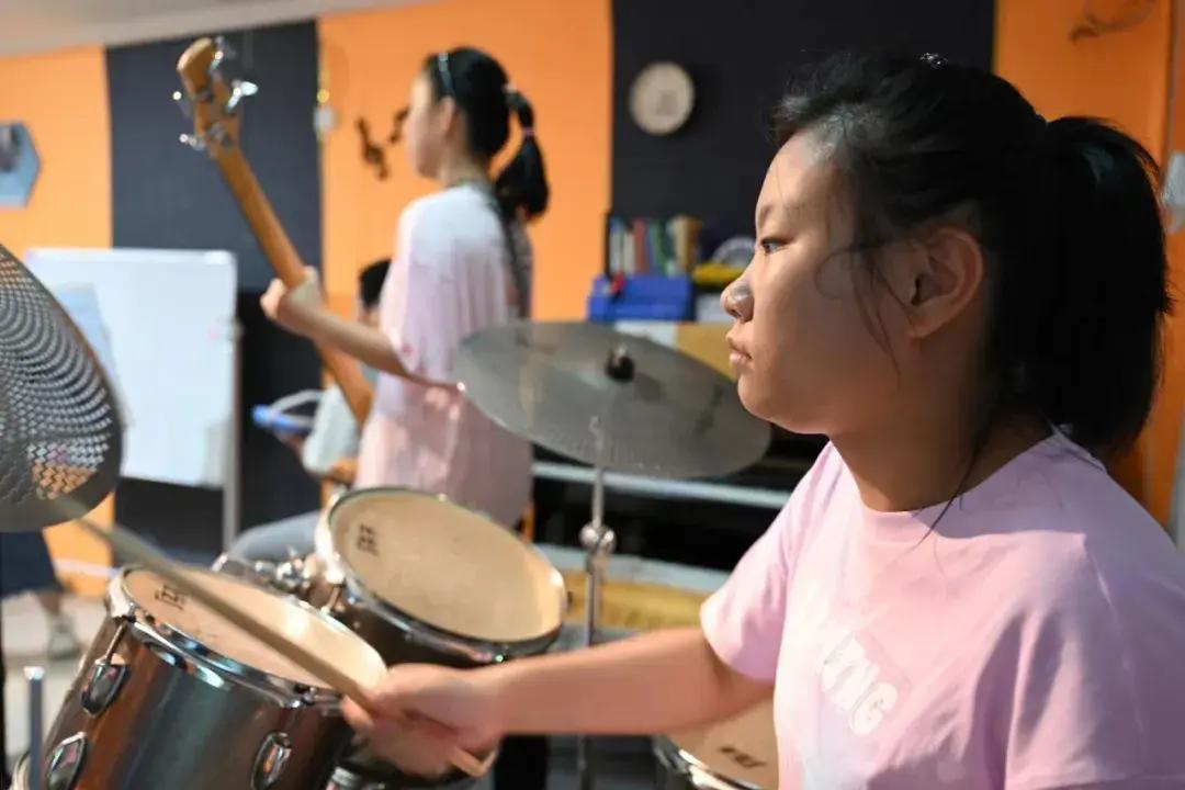 2018年某天開始,她每次在琴行練完鋼琴,路過架子鼓教室,都要駐足張望,看一會兒,又跑進去摸。因此她的課程增加了架子鼓。
