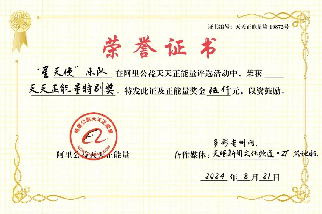 阿里公益天天正能量聯合多彩貴州網、天眼新聞文化頻道•27°黔地標,爲“星天使”樂隊正能量特別獎及獎金5000元: