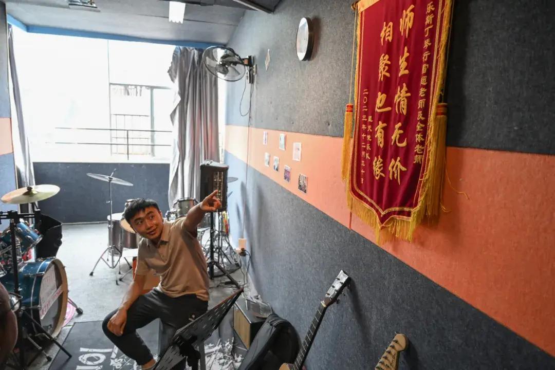 樂隊老師雷超指着家長送的錦旗