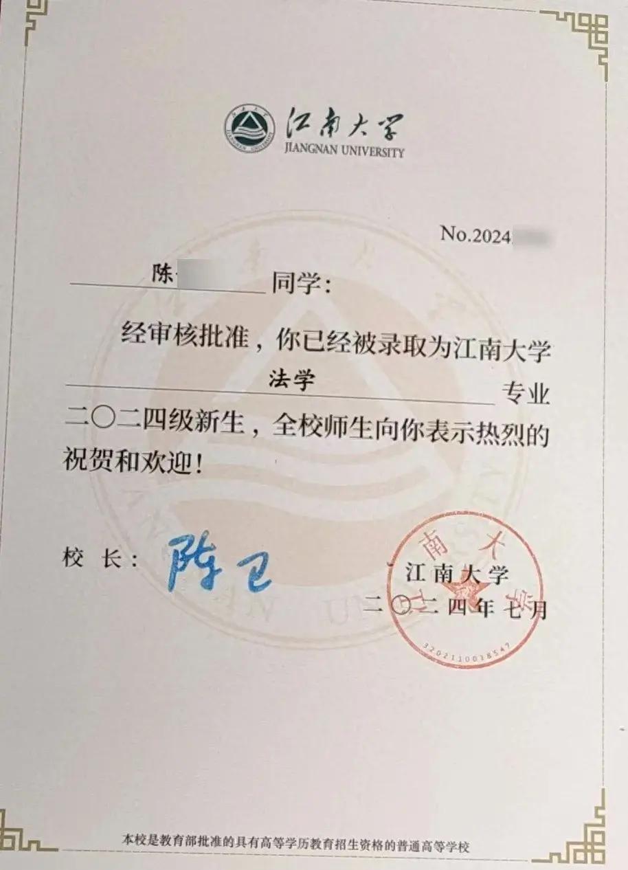 小陳(化名)家住河南信陽韓樓村,家庭條件特殊的她,即將到江南大學法學院就讀。今年高考,她考出了599分的好成績。