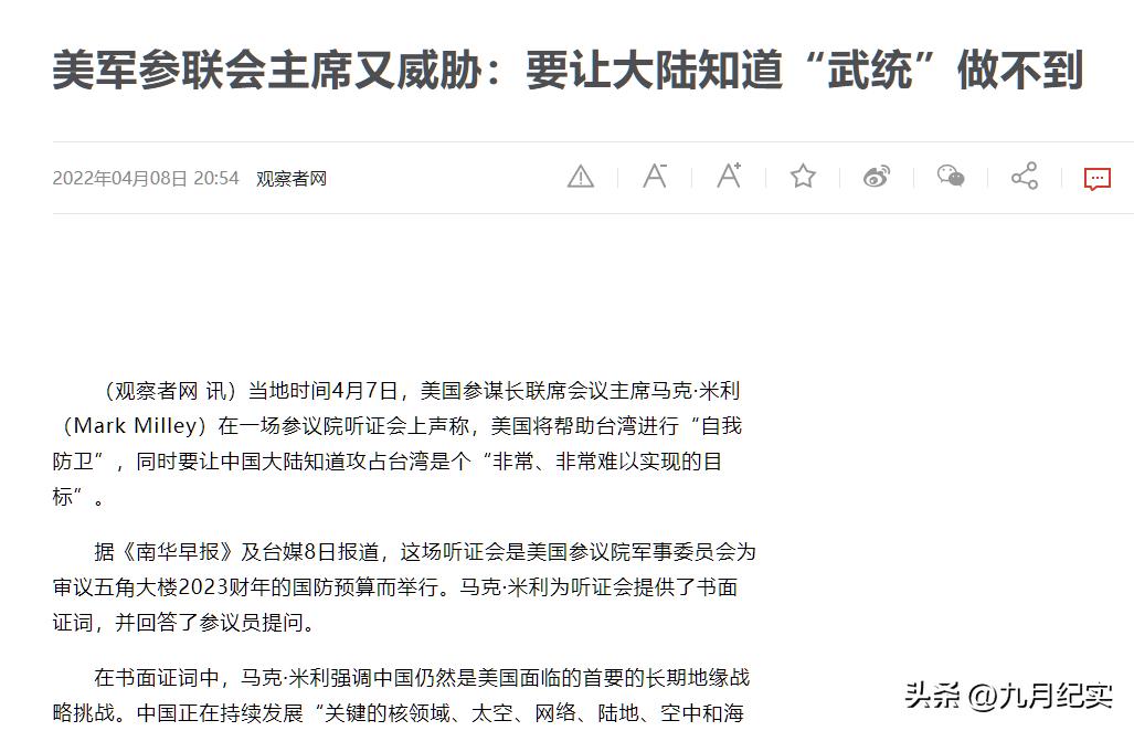 觀察者網2022-04-08報道:美軍參聯會主席又威脅:要讓大陸知道“武統”做不到