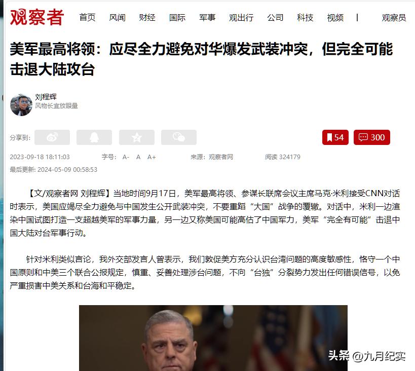 觀察者網2023-09-18報道:美軍最高將領:應盡全力避免對華爆發武裝衝突,但完全可能擊退大陸攻臺