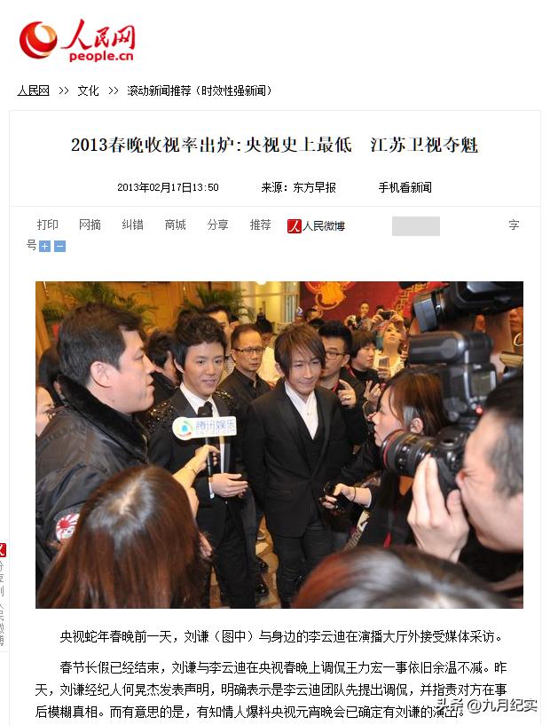 人民網2013-02-17報道:2013春晚收視率出爐:央視史上最低 江蘇衛視奪魁