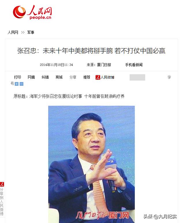 人民網2014-11-18報道:張召忠:未來十年中美都將掰手腕 若不打仗中國必贏