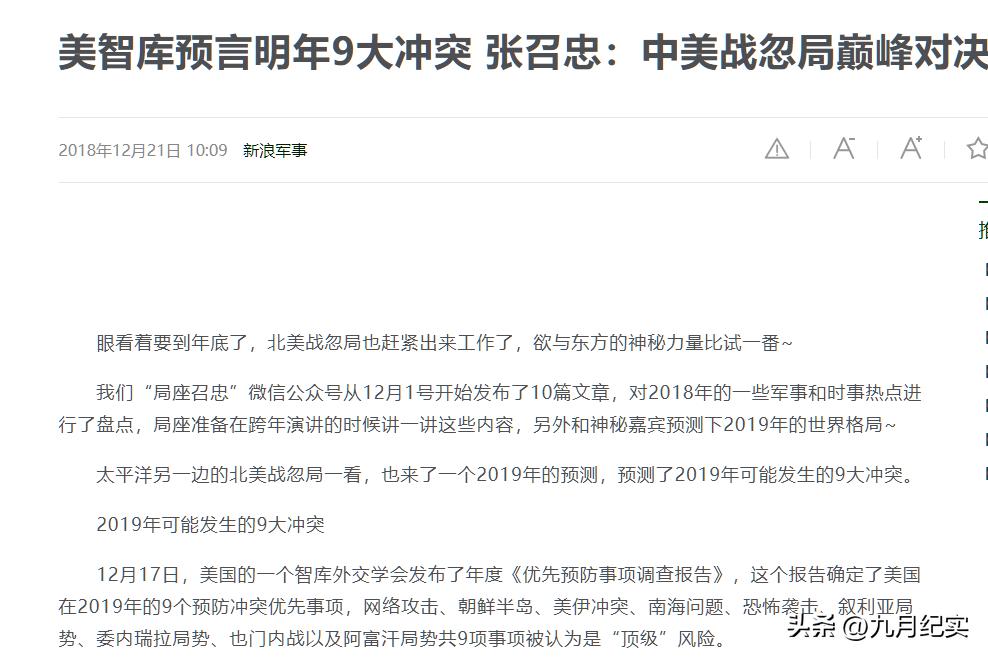 新浪軍事2018-12-21報道:美智庫預言明年9大沖突 張召忠:中美戰忽局巔峯對決