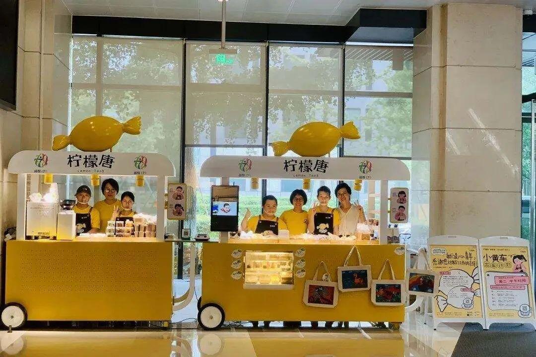 到了下午,浙江寧波一地鐵站內,多了幾個黃色的小車。一羣身着黃色馬甲的青年,正在售賣咖啡、文創。
